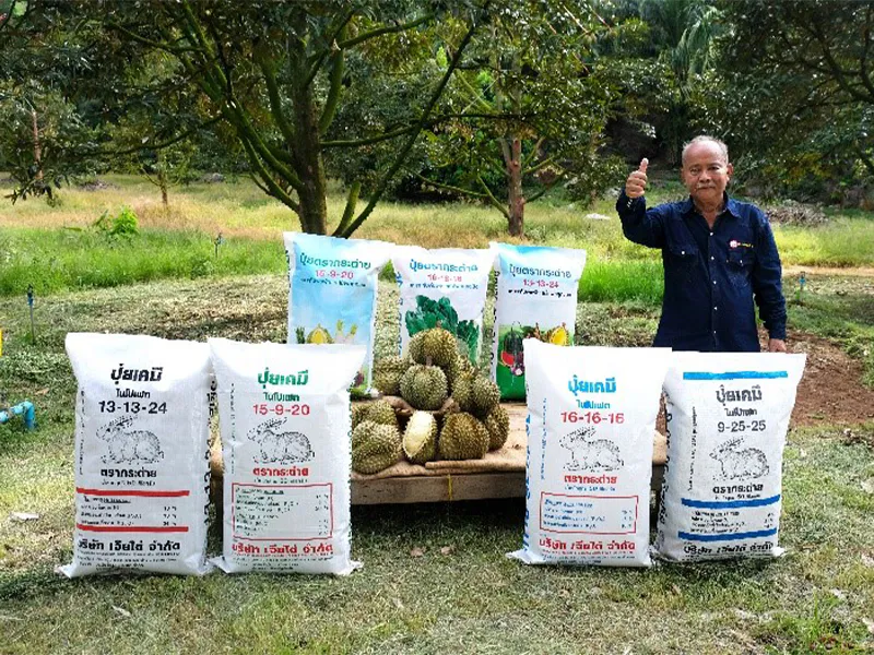 - การบำรุงทุเรียนช่วงก่อนทำสาร หรือระยะสะสมอาหาร จะใช้ปุ๋ยตรากระต่าย สูตร 9-25-25 อัตรา 3 กก./ต้น บำรุงต้นในระยะสะสมอาหาร เพื่อให้ทุเรียน แตกตาดอก ได้ดี