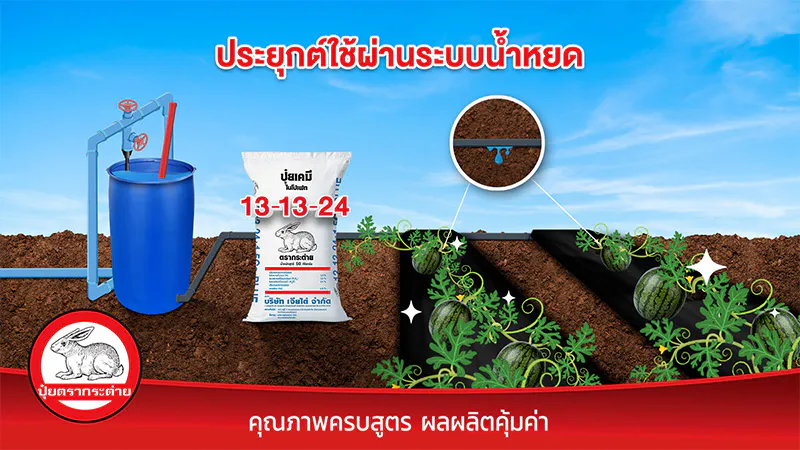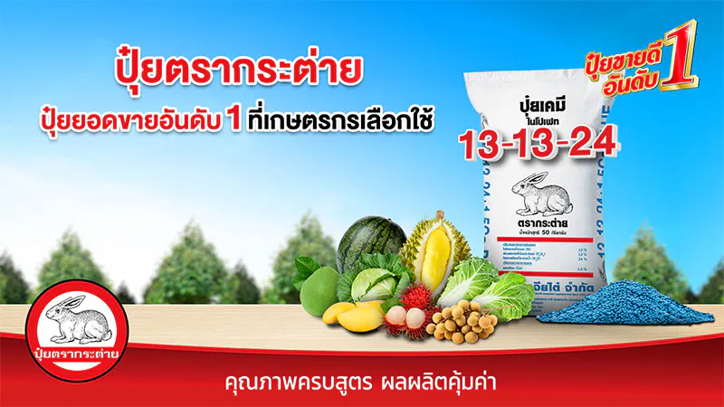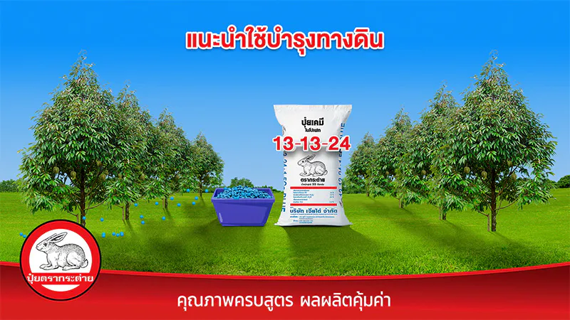 ปุ๋ยตรากระต่าย สูตร 13-13-24 บลู ปุ๋ยคุณภาพ เหมาะสำหรับบำรุงช่วงขยายผล เพิ่มน้ำหนัก ให้ผลผลิตดี มีคุณภาพ ปุ๋ยตรากระต่าย สูตร 13-13-24 บลู เป็นปุ๋ยคอมปาวด์ มีธาตุอาหารหลักและธาตุอาหารรองครบถ้วนในเม็ดเดียว นำเข้าจากแหล่งผลิตชั้นนำ ที่มีกระบวนการผลิตที่ได้มาตรฐานระดับสากล เม็ดปุ๋ยสีฟ้า แกร่ง กลมเกลี้ยง ละลายง่าย พืชดูดซับธาตุอาหารไปใช้ได้ไว ทำให้เกษตรกรชาวสวนมั่นใจในประสิทธิภาพของ ปุ๋ยตรากระต่าย สูตร 13-13-24 บลู