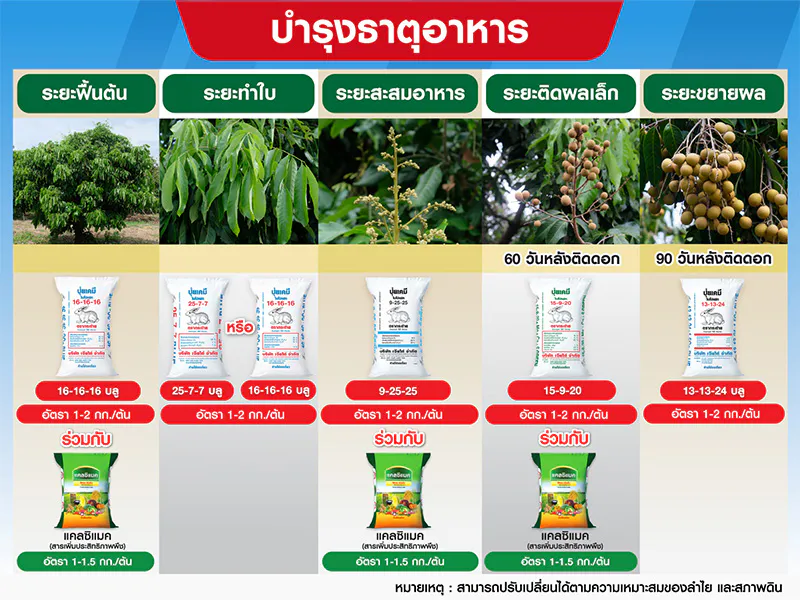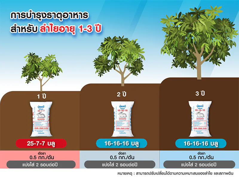 เมื่อต้นลำไยอายุ 2-3 ปี จะเป็นช่วงที่เน้นการเจริญเติบโตของต้น แนะนำบำรุงด้วยปุ๋ยตรากระต่าย สูตร 16-16-16 บลู อัตรา 0.5 กิโลกรัมต่อต้น โดยแบ่งใส่ 2 ครั้งต่อปี เพื่อช่วยให้ต้นเจริญเติบโตแข็งแรง เตรียมพร้อมเข้าสู่การให้ผลผลิตในระยะต่อไป