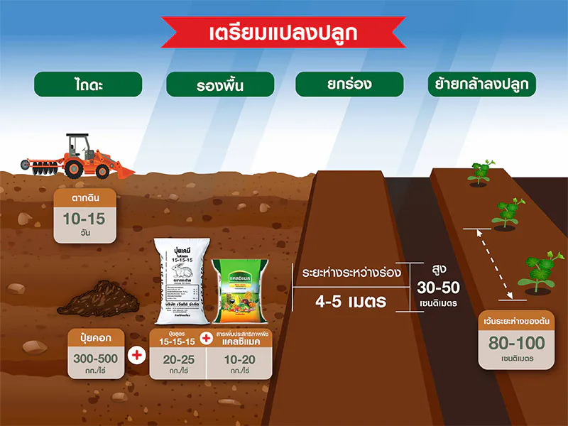 ก่อนทำการปลูก แนะนำให้ปรับปรุงดิน ด้วยการใส่ปุ๋ยคอก อัตรา 300-500 กิโลกรัมต่อไร่ เพื่อช่วยให้ดินอุ้มน้ำได้ดี และเพิ่มธาตุอาหารในดินเพื่อให้ดินสมบูรณ์ โดยใส่ปุ๋ยตรากระต่าย สูตร 15-15-15 อัตรา 20-25 กิโลกรัม/ไร่ ร่วมกับแคลซิแมค (สารเพิ่มประสิทธิภาพพืช) อัตรา 10-20 กิโลกรัมต่อไร่ ในการจัดการน้ำในแปลงปลูก พี่น้องเกษตรกรสามารถวางระบบน้ำหยด หรือ ทำร่องน้ำ หรือ ให้น้ำทางสายยาง โดยฟักทองเป็นพืชที่ต้องให้น้ำอย่างสม่ำเสมอ แต่ไม่มากจนเกินไป และไม่ชอบพื้นที่น้ำขังเพราะจะทำให้รากเน่าได้ และไม่ควรให้น้ำช่วงเย็น เพราะความชื้นจะทำให้ต้นฟักทองเป็นโรคได้ง่าย