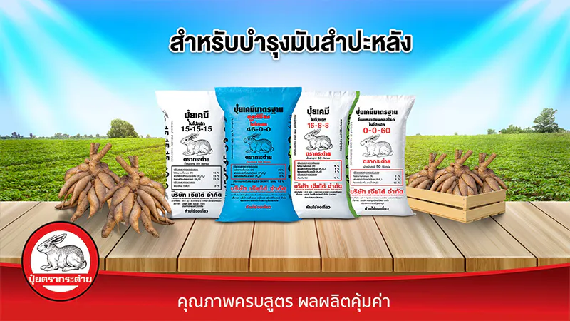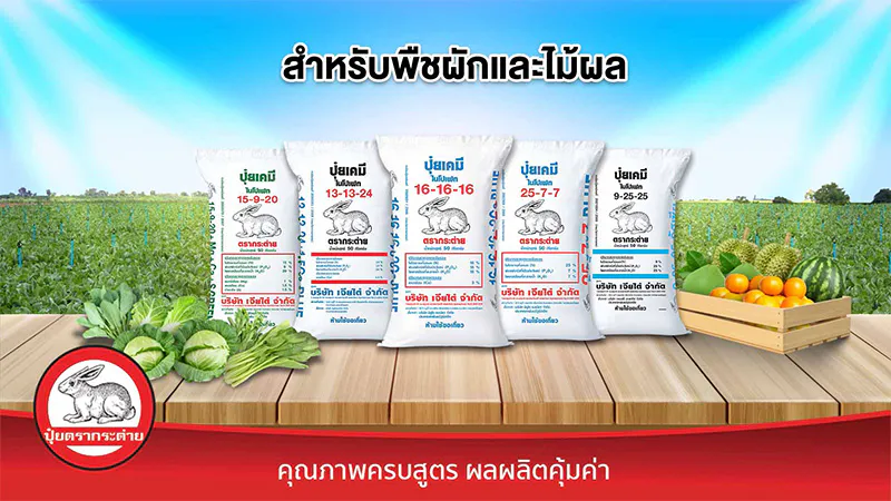 - สำหรับพืชผักและไม้ผล แนะนำบำรุงด้วยปุ๋ยตรากระต่าย สูตร 25-7-7 บลู, ปุ๋ยตรากระต่าย สูตร 16-16-16 บลู, ปุ๋ยตรากระต่าย สูตร 9-25-25, ปุ๋ยตรากระต่าย สูตร 15-9-20 และปุ๋ยตรากระต่าย สูตร 13-13-24 บลู ด้วยคุณสมบัติเด่นของปุ๋ยตรากระต่าย ที่เม็ดปุ๋ยละลายง่าย ทำให้พืชสามารถนำไปใช้ได้ไว และประยุกต์ใช้กับระบบน้ำหยดได้ดี