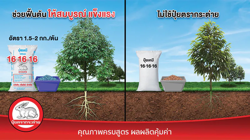 ปุ๋ยตรากระต่าย สูตร 16-16-16 บลู เหมาะสำหรับพืชผักและไม้ผลทุกชนิด ตอบโจทย์พี่น้องชาวสวน เพื่อให้ผลผลิตดี ชัวร์ เด๊ะ เด๊ะ โดยปุ๋ยสูตรนี้มีคุณสมบัติที่โดดเด่น ดังนี้