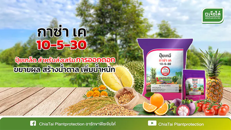 ปุ๋ยเกล็ดคุณภาพสูง “กาซ่า เค 10-5-30 (+2+TE)” ปุ๋ยเกล็ดสูตรที่เหมาะสำหรับการ กระตุ้นดอก ขยายผล สร้างน้ำตาล เพิ่มน้ำหนัก ซึ่งอัดแน่นด้วยธาตุอาหารหลัก ธาตุอาหารรอง และธาตุอาหารเสริม (TE) ในรูปคีเลต 100% นำเข้าจากประเทศเยอรมันนี