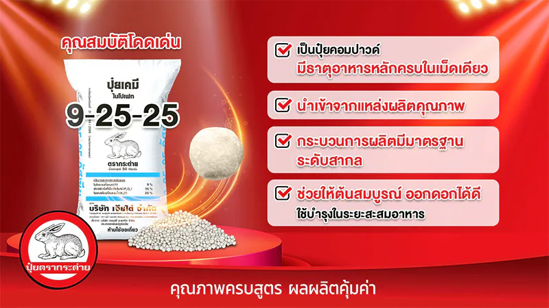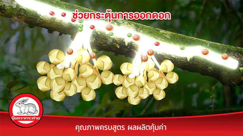 ไม้ผลจัดเป็นพืชที่ให้ผลผลิตปีละครั้ง ตามระยะการออกดอก ทำให้ระยะสะสมอาหารเพื่อออกดอก เป็นระยะที่สำคัญ ที่พี่น้องชาวสวนจะคอยใส่ใจดูแลให้ต้นออกดอกที่สมบูรณ์ เพื่อผลผลิตที่ดี สำหรับการออกดอกนั้น ยังสามารถแบ่งเป็น 2 ประเภท คือ การออกดอกตามฤดูกาลผลิต และการบังคับให้ออกดอกนอกฤดูกาลผลิต แต่จะมีการบำรุงที่เหมือนกัน โดยเน้นปุ๋ยสูตรที่มีธาตุฟอสฟอรัสสูง เพื่อช่วยในการกระตุ้นการออกดอก อย่างปุ๋ยตรากระต่าย สูตร 9-25-25 ที่แนะนำให้ใช้บำรุงตั้งแต่ระยะสะสมอาหาร ต่อเนื่องจนเข้าสู่ระยะออกดอก เพื่อให้ดอกสมบูรณ์ และลดปัญหาดอกร่วง ดอกฝ่อ ออกดอกน้อย หรือไม่ออกดอกเลย ได้อีกด้วย