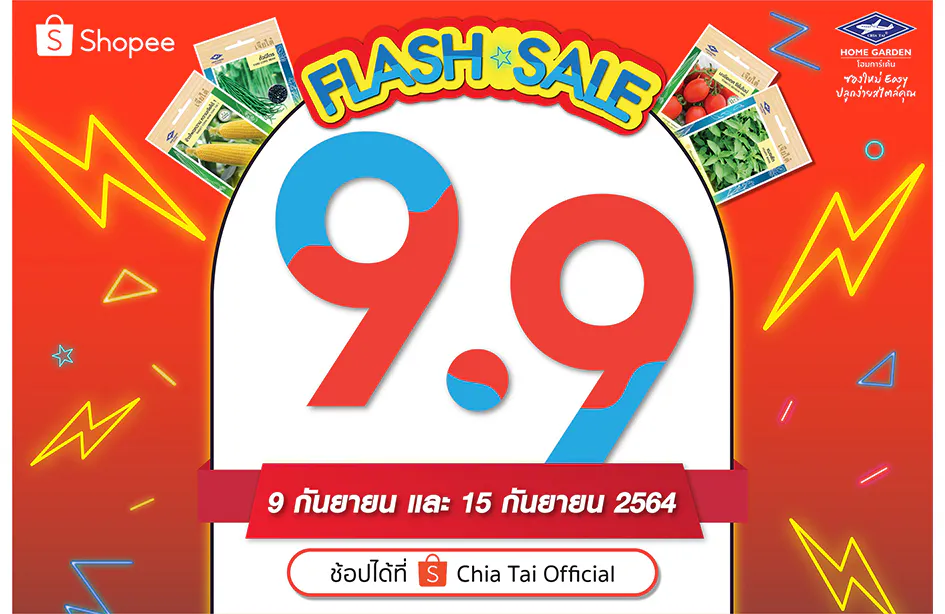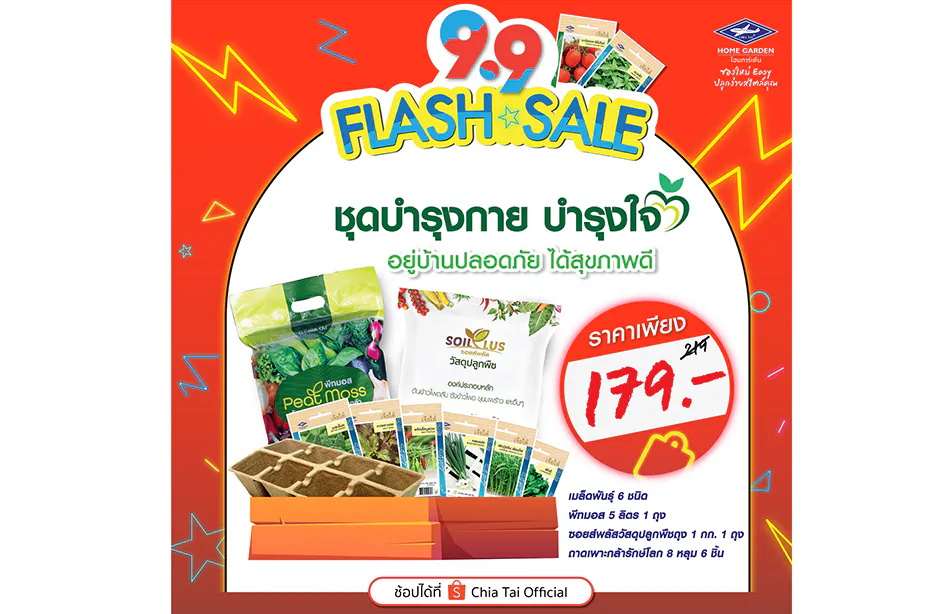 กรุงเทพฯ 8 กันยายน 2564 – เจียไต๋ โฮมการ์เด้น โดยกลุ่มบริษัทเจียไต๋ ผู้นำธุรกิจนวัตกรรมการเกษตรของไทย ส่งโปรโมชั่นเอาใจสายปลูกให้ช้อปสนุกถูกใจกว่าเคย ด้วยดีลเด็ดๆ ที่พลาดไม่ได้กับ Flash Sale 9.9 จัดขบวนสินค้ามาให้เลือกซื้อในราคาพิเศษ ไม่ว่าจะเป็นเมล็ดพืชผักสวนครัวสายพันธุ์ทั่วไป (OP) ที่ผลิตผลล้วนเป็นวัตถุดิบในจานโปรดของแทบทุกบ้าน เช่น กะเพรา ผักบุ้งจีน คะน้าฮ่องกง มะเขือเทศสีดา เป็นต้น ในราคาเพียงซองละ 12 บาท (จากราคาปกติ 15 บาท) หรือเมล็ดพันธุ์สายพันธุ์ลูกผสม (F1 Hybrid) ที่หลายคนชื่นชอบในรสชาติผลสด อย่างแตงกวา มินิคิวค์ ลิซ่า เมล่อน โกลเด้นควีน แตงโม สมูทตี้ ไร้เมล็ด มินิบร็อคโคลี รอยัล เป็นต้น ในราคาซองละ 22 บาท (จากราคาปกติ 25 บาท) และพลาดไม่ได้กับชุดปลูก “บำรุงกาย บำรุงใจ” เพียงชุดเดียวได้ครบ ลงมือปลูกได้ทันที ประกอบด้วยเมล็ดพันธุ์ผักที่ช่วยบำรุงร่างกายต้านโรคภัยจำนวน 6 ซอง ได้แก่ มะระขี้นก กะเพราแดง พริกขี้หนูสวน หอมแบ่ง ผักบุ้งจีนเรียวไผ่ และผักชี พร้อมด้วยวัสดุปลูกพีทมอสเจียไต๋ขนาด 5 ลิตร 1 ถุง ถาดเพาะกล้ารักษ์โลก 8 หลุม 6 ชิ้น และวัสดุปลูกซอยล์พลัสอีก 1 กิโลกรัม ในราคาสุดพิเศษ 179 บาท (จากราคาปกติ 219 บาท) เตรียมช้อปกันได้แล้วกับโปรโมชั่นเด็ดๆ ที่เจียไต๋ โฮมการ์เด้น ขนทัพสินค้าจัดเต็ม 2 วันโดนๆ เฉพาะวันที่ 9 กันยายน 2564 และ 15 กันยายน 2564 เท่านั้น