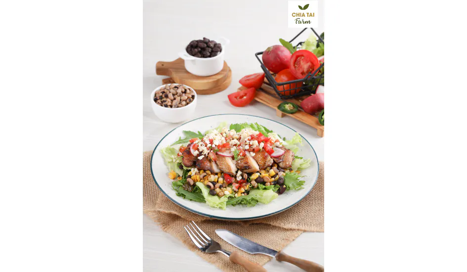 ในส่วนของสลัดทั้ง 2 รายการ นอกจากความอร่อยจากความสดใหม่ และความโดดเด่นด้านรสชาติของสายพันธุ์ข้าวโพดของเจียไต๋แล้ว เชฟเลือกใช้น้ำสลัดซิตรัส วีเนเกรท (citrus vinaigrette) ที่ให้ความเบา สดชื่นเมื่อรับประทานคู่กับผักสลัดและข้าวโพดย่าง จึงกลายเป็นมื้อแห่งความอร่อย ที่มาพร้อมสุขภาพอย่างแท้จริง นอกจากนั้นเจียไต๋ฟาร์มยังส่งเมนูสลัดไก่ย่าง ในสไตล์ South Western American ที่มีกลิ่นอายของอาหารเม็กซิกัน ที่เข้ากันได้ดีกับซัลซ่ามะเขือเทศ