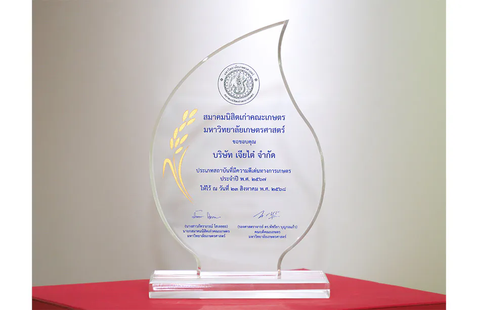 บริษัท เจียไต๋ จำกัด ผู้นำธุรกิจนวัตกรรมการเกษตรของไทย โดยคุณทวีสุข เมฆธวัชชัยกุล Chief Commercial Officer เป็นตัวแทนรับโล่รางวัลเชิดชูเกียรติ “สถาบันที่มีความดีเด่นทางการเกษตร พ.ศ. 2567” ในพิธีมอบรางวัล “นิสิตเก่าดีเด่น คณะเกษตร บุคคลดีเด่นทางการเกษตร และสถาบันดีเด่นทางการเกษตร พ.ศ. 2567” ภายในงานรวงทองคืนทุ่ง 2568 – Aggie Day'68 จัดโดยสมาคมนิสิตเก่าคณะเกษตร มหาวิทยาลัยเกษตรศาสตร์ เมื่อวันที่ 23 สิงหาคม 2568 ณ อาคารวชิรานุสรณ์ คณะเกษตร โดยรางวัลนี้จัดขึ้นเพื่อเชิดชูองค์กรและบุคคลที่มีผลงานโดดเด่น เป็นที่ยอมรับในวงการเกษตร มีบทบาทสำคัญต่อการพัฒนาเกษตรกรรมของประเทศ และสร้างสรรค์กิจกรรมที่เป็นประโยชน์ต่อสังคม