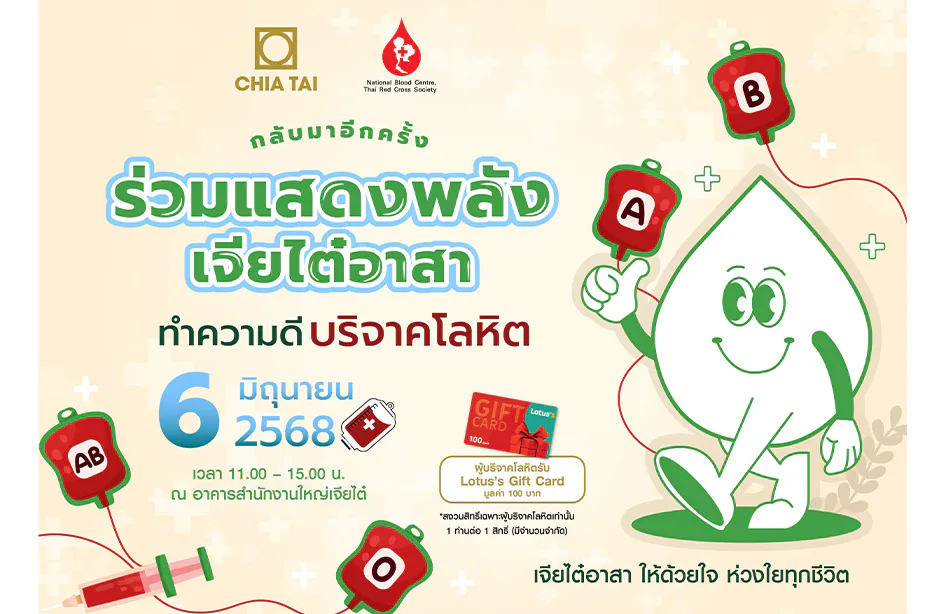 กรุงเทพฯ – บริษัท เจียไต๋ จำกัด ผู้นำธุรกิจนวัตกรรมการเกษตรของไทย ร่วมกับสภากาชาดไทย เดินหน้าสานต่อกิจกรรมเพื่อสังคมในโครงการ “เจียไต๋อาสา ให้ด้วยใจ ห่วงใยทุกชีวิต” ครั้งที่ 4 ขอเชิญชวนผู้ที่สนใจรวมพลังบริจาคโลหิตช่วยเหลือผู้ป่วยที่กำลังรอความหวังในการรักษา ในวันที่ 6 มิถุนายน 2568 เวลา 11.00 - 15.00 น. ณ อาคารสำนักงานใหญ่ เจียไต๋ สุขุมวิท 60 โดยผู้บริจาคโลหิตจะได้รับบัตรของขวัญโลตัสแทนคำขอบคุณสำหรับการร่วมแบ่งปันความช่วยเหลือ (1 ท่านต่อ 1 สิทธิ์ สงวนสิทธิ์เฉพาะผู้บริจาคโลหิต และของมีจำนวนจำกัด)
