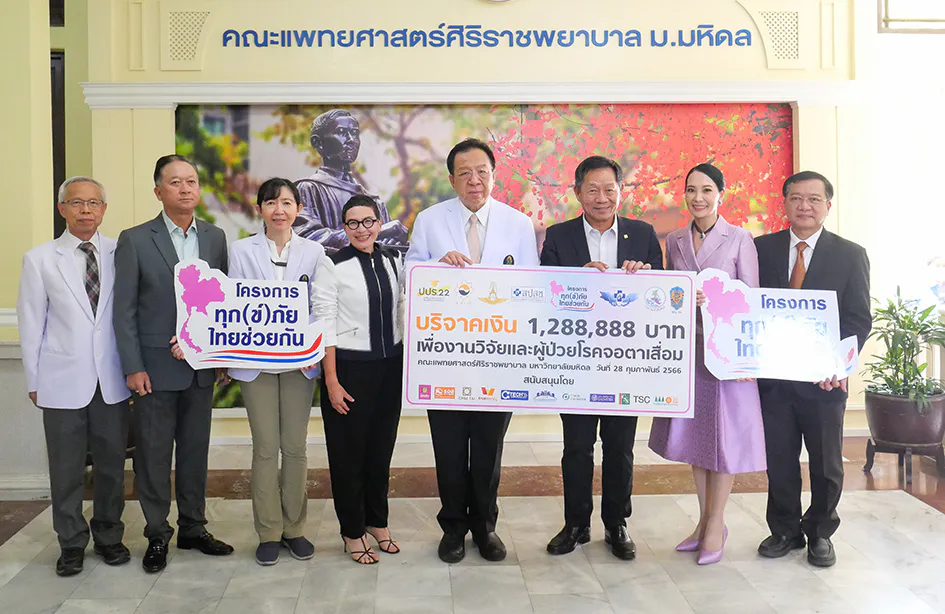 กรุงเทพฯ 9 มีนาคม 2566 – นายมนัส เจียรวนนท์ ประธานคณะผู้บริหาร บริษัท เจียไต๋ จำกัด ผู้นำธุรกิจนวัตกรรมการเกษตรของไทย พร้อมด้วยคณะผู้บริหารโครงการทุก(ข์)ภัย ไทยช่วยกัน สานต่อการดำเนินการโครงการ มอบเงินสนับสนุนมูลค่า 1,288,888 บาทให้กับคณะแพทยศาสตร์ศิริราชพยาบาล มหาวิทยาลัยมหิดล เพื่อส่งเสริมการพัฒนางานวิจัยและช่วยเหลือผู้ป่วยโรคจอตาเสื่อม โดยได้รับเกียรติจาก ศาสตราจารย์คลินิก นายแพทย์วิศิษฎ์ วามวาณิชย์ ผู้อำนวยการโรงพยาบาลศิริราช และศาสตราจารย์แพทย์หญิงละอองศรี อัชชะนียะสกุล หัวหน้าโครงการวิจัย “เซลล์บำบัดสำหรับโรคจอตาเสื่อมที่ถ่ายทอดทางพันธุกรรม” เป็นผู้รับมอบ ณ ห้องรับรองงานองค์กรสัมพันธ์และกิจการพิเศษ ตึกอำนวยการชั้น 1 โรงพยาบาลศิริราช