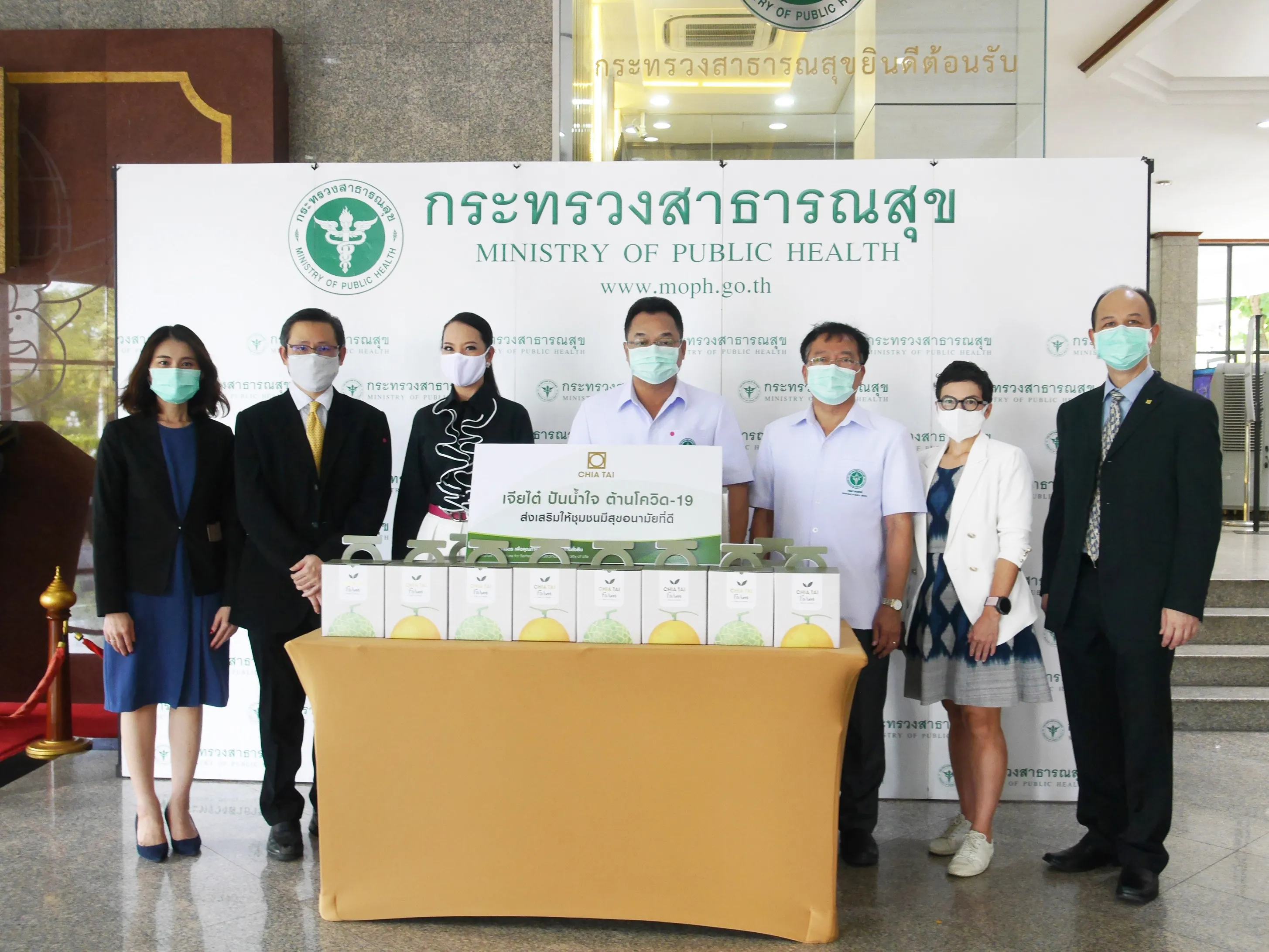 กรุงเทพฯ 1 กรกฎาคม 2564 – คณะผู้บริหาร บริษัท เจียไต๋ จำกัด ผู้นำธุรกิจนวัตกรรมการเกษตรของไทย เดินหน้าโครงการ “เจียไต๋ ปันน้ำใจ สู่ชุมชน” อย่างต่อเนื่อง เพื่อส่งเสริมสุขอนามัยและเสริมเกราะป้องกันโควิด-19 ให้ชุมชนและสังคมไทยสามารถก้าวผ่านวิกฤตครั้งนี้ไปด้วยกันภายใต้แนวคิดซีพีร้อยเรียงความดี โดยครั้งนี้ ได้ส่งมอบกำลังใจเพื่อสนับสนุนภารกิจการปฏิบัติงานสถานการณ์โรคโควิด-19 ของสำนักงานปลัดกระทรวงสาธารณสุข ผ่านการมอบผลิตผลสดเมล่อนมรกต เจียไต๋ ฟาร์ม จำนวน 500 ผล โดย นพ. ภูวเดช สุระโคตร ผู้ช่วยปลัดกระทรวงสาธารณสุข และ ผศ.นพ. ปราการ ถมยางกูร ที่ปรึกษากรมการแพทย์ ให้เกียรติเป็นผู้รับมอบ ณ สำนักงานปลัดกระทรวงสาธารณสุข