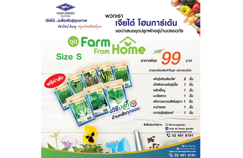 ชุดปลูกผักอยู่บ้านปลอดภัย Farm From Home นี้ ปลูกได้ง่ายโดยสามารถพลิกอ่านวิธีปลูกได้ที่ด้านหลังซองเมล็ดพันธุ์เจียไต๋ โฮมการ์เด้น ทั้งยังปลูกได้อย่างสะดวกสบายแม้ในพื้นที่จำกัดอย่างมุมเล็กๆ ของบ้าน อะพาร์ตเมนต์ หรือคอนโดมิเนียม ผู้ที่สนใจสามารถสอบถามข้อมูลเพิ่มเติมหรือสั่งซื้อ (พรีออเดอร์ 7-14 วัน) ได้ทาง www.ct-homegarden.com / Line : @homegarden / Facebook : Chia Tai Home Garden www.facebook.com/cthomegarden เพื่อให้การอยู่บ้าน ปลอดภัย ปลอดเชื้อ และยังเข้าถึงแหล่งอาหารพืชผักที่สดสะอาดที่ปลูกได้ด้วยตัวเอง สร้างความมั่นคงทางอาหารได้ในช่วงวิกฤตนี้