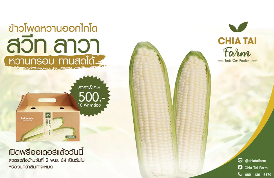 กรุงเทพฯ 26 ตุลาคม 2564 – สำหรับใครที่รอคอยข้าวโพดหวานฮอกไกโด สวีท ลาวา ข้าวโพดหวานสีขาวนวลที่หลายคนหลงรักในรสสัมผัสและรสชาติ เจียไต๋ฟาร์ม โดยกลุ่มบริษัทเจียไต๋ ผู้นำธุรกิจนวัตกรรมการเกษตรของไทย ได้คัดสรรข้าวโพดหวานคุณภาพซึ่งเก็บผลิตผลสดๆ จากฟาร์มมาให้คุณได้จับจอง พร้อมส่งตรงถึงหน้าบ้านให้ลิ้มลองความหวานกรอบอร่อยในทุกๆ คำแล้ววันนี้