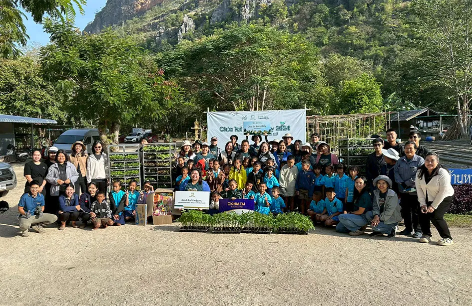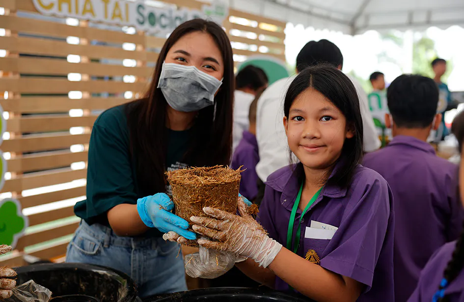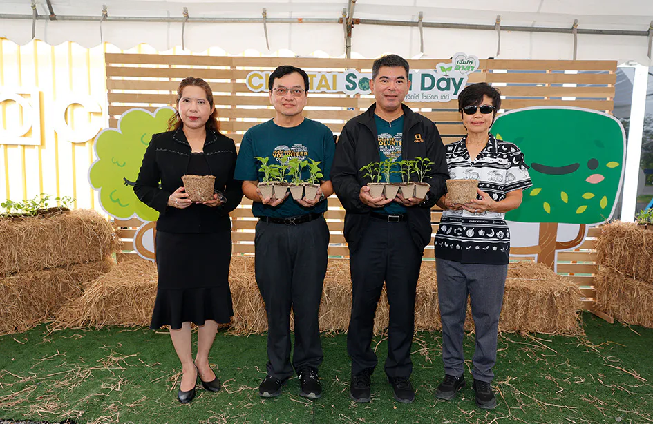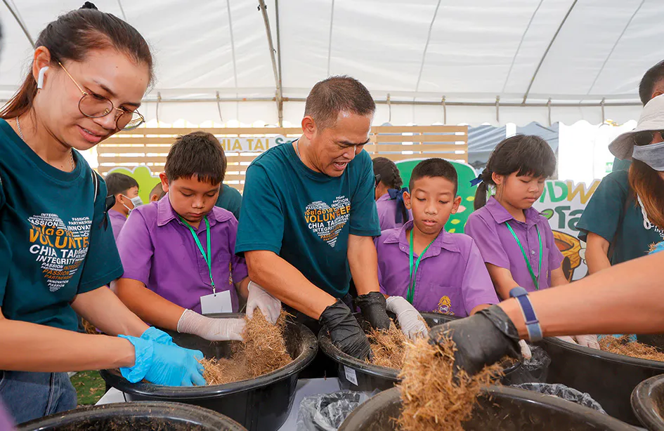ต่อด้วยฐานที่ 2 “กระถางฟาง รักษ์โลก” ที่ทุกคนได้เรียนรู้ว่าฟางข้าวซึ่งเดิมที่มักถูกเผาทิ้งหรือไม่ได้ถูกนำมาใช้ประโยชน์ สามารถแปรรูปเป็นกระถางต้นไม้เป็นมิตรต่อสิ่งแวดล้อม ช่วยลดการปล่อยคาร์บอนฟุตพรินต์ และเป็นการคืนชีวิตใหม่ให้ทรัพยากรธรรมชาติ และปิดท้ายด้วยฐานที่ 3 “เพาะกล้า เติมยิ้ม” ที่น้องๆ นักเรียนและเจียไต๋อาสาร่วมกันเพาะกล้าจากเมล็ดพันธุ์คุณภาพจากเจียไต๋ อาทิ มะเขือเทศ กะเพรา โหระพา พริก และมะเขือ ก่อนนำลงปลูกในกระถางฟางข้าว เพื่อเรียนรู้การปลูกผักกินเองและนำความสุขกลับไปแบ่งปันที่บ้าน โดยทุกต้นกล้าที่ถูกเพาะในวันนี้ คือสัญลักษณ์ของการเริ่มต้นสิ่งดีๆ ที่กำลังเติบโตจากหัวใจของเจียไต๋อาสาทุกคน