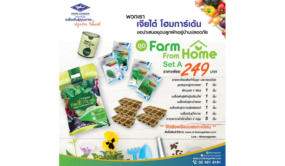 ผู้สนใจสามารถสั่งซื้อชุดปลูกผักอยู่บ้านปลอดภัย Farm From Home (Set A) ได้ในราคาเพียง 249 บาท เจียไต๋ โฮมการ์เด้นพร้อมบริการจัดส่งฟรีถึงบ้าน สั่งซื้อได้ทาง