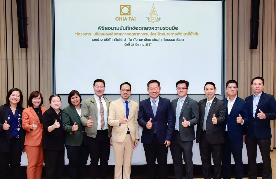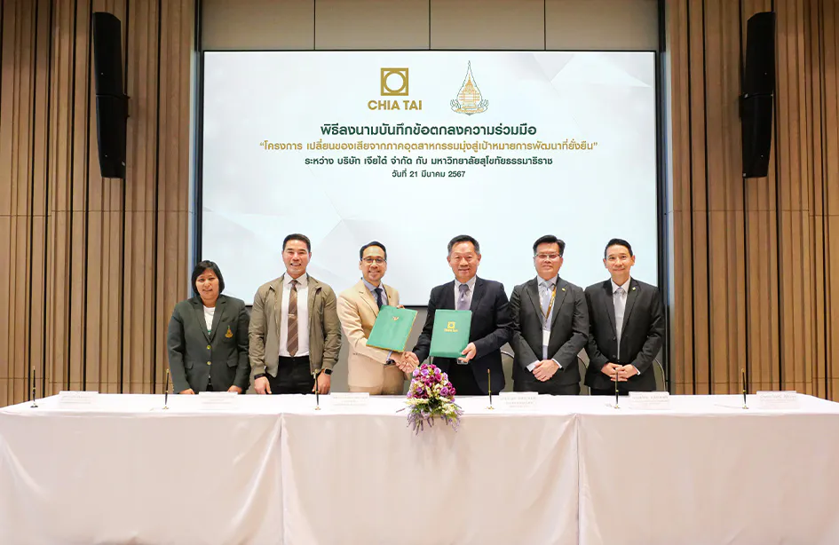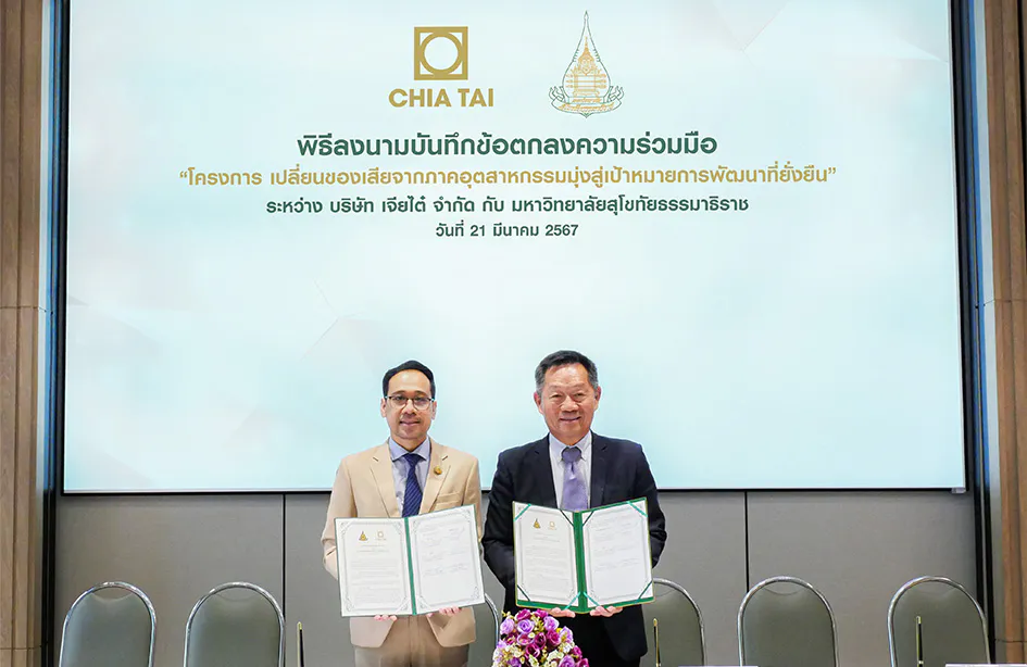 วันที่ 21 มีนาคม พ.ศ. 2567 บริษัท เจียไต๋ จำกัด และ มหาวิทยาลัยสุโขทัยธรรมาธิราช ได้ร่วมลงนามบันทึกข้อตกลงความร่วมมือโครงการเปลี่ยนของเสียจากภาคอุตสาหกรรมมุ่งสู่เป้าหมายการพัฒนาที่ยั่งยืน โดยมีนายมนัส เจียรวนนท์ ประธานคณะผู้บริหาร บริษัท เจียไต๋ จำกัด และ ผู้ช่วยศาสตราจารย์ ดร.พนมพัทธ์ สมิตานนท์ กรรมการสภามหาวิทยาลัย รักษาการแทนอธิการบดีมหาวิทยาลัยสุโขทัยธรรมาธิราช ร่วมลงนามบันทึกข้อตกลงความร่วมมือในครั้งนี้ ณ บริษัท เจียไต๋ จำกัด สำนักงานใหญ่ กรุงเทพฯ