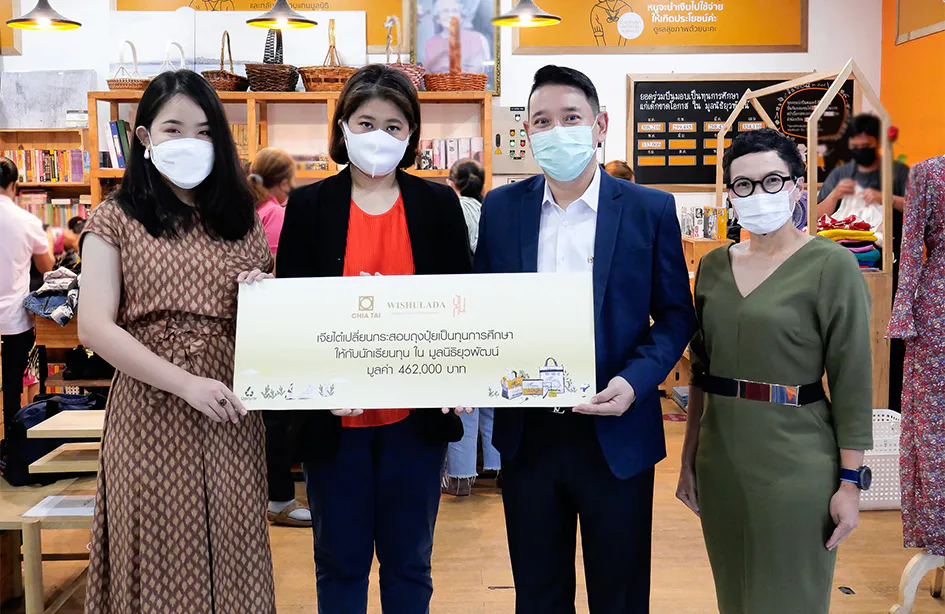 กรุงเทพฯ 2 มิถุนายน 2565 – นายประวินทร์ คุโรวาท ประธานบริหารด้านการเงินและบริหารกลาง พร้อมด้วยนางสาวอณิมา ทัศจันทร์ ผู้จัดการทั่วไป ฝ่ายสื่อสารองค์กร บริษัท เจียไต๋ จำกัด ผู้นำธุรกิจนวัตกรรมการเกษตรของไทย และนางสาววิชชุลดา ปัณฑรานุวงศ์ ศิลปินผู้สร้างสรรค์งานศิลปะจากวัสดุเหลือใช้ (Social Activist Artist) และผู้ออกแบบคอลเล็กชัน แรบ อะแดป ร่วมกิจกรรมส่งมอบทุนการศึกษาจากการจัดจำหน่ายกระเป๋าคอลเล็กชัน แรบ อะแดป ให้กับนักเรียนทุนที่ขาดโอกาส ใน มูลนิธิยุวพัฒน์ โดยมีนางฐาปนีย์ สินาดโยธารักษ์ ผู้อำนวยการโครงการร้านปันกัน โดยมูลนิธิยุวพัฒน์ ให้เกียรติเป็นผู้รับมอบ