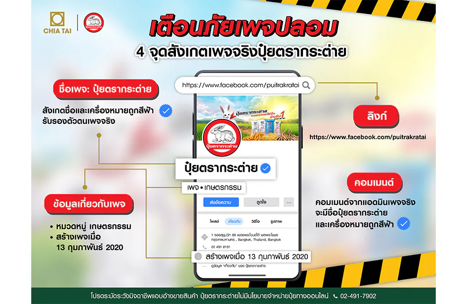 จากกรณีดังกล่าว บริษัท เจียไต๋ จำกัด ขอเรียนแจ้งว่า บริษัทฯ ไม่มีส่วนเกี่ยวข้องในการแอบอ้างดังกล่าว และบริษัทฯ ไม่มีนโยบายจำหน่ายสินค้าปุ๋ยตรากระต่าย รวมถึงการเรียกเก็บเงินจากประชาชนผ่านช่องทางออนไลน์ บริษัทฯ ดำเนินการจัดจำหน่ายสินค้าปุ๋ยตรากระต่ายตามข้อกำหนดในพระราชบัญญัติปุ๋ย พ.ศ. 2518 ซึ่งกำหนดให้การจำหน่ายปุ๋ยเคมีต้องดำเนินการผ่านร้านค้าตัวแทนจำหน่ายที่มีใบอนุญาตจากกรมวิชาการเกษตรเท่านั้น นอกจากนี้ บริษัทฯ มีเฟซบุ๊กทางการเพียงเพจเดียว ภายใต้ชื่อ “เจียไต๋ Chia Tai” https://www.facebook.com/Chiatai.group.official และสินค้าปุ๋ยตรากระต่ายมีเฟซบุ๊กทางการเพียงเพจเดียว ภายใต้ชื่อ “ปุ๋ยตรากระต่าย” https://www.facebook.com/puitrakratai